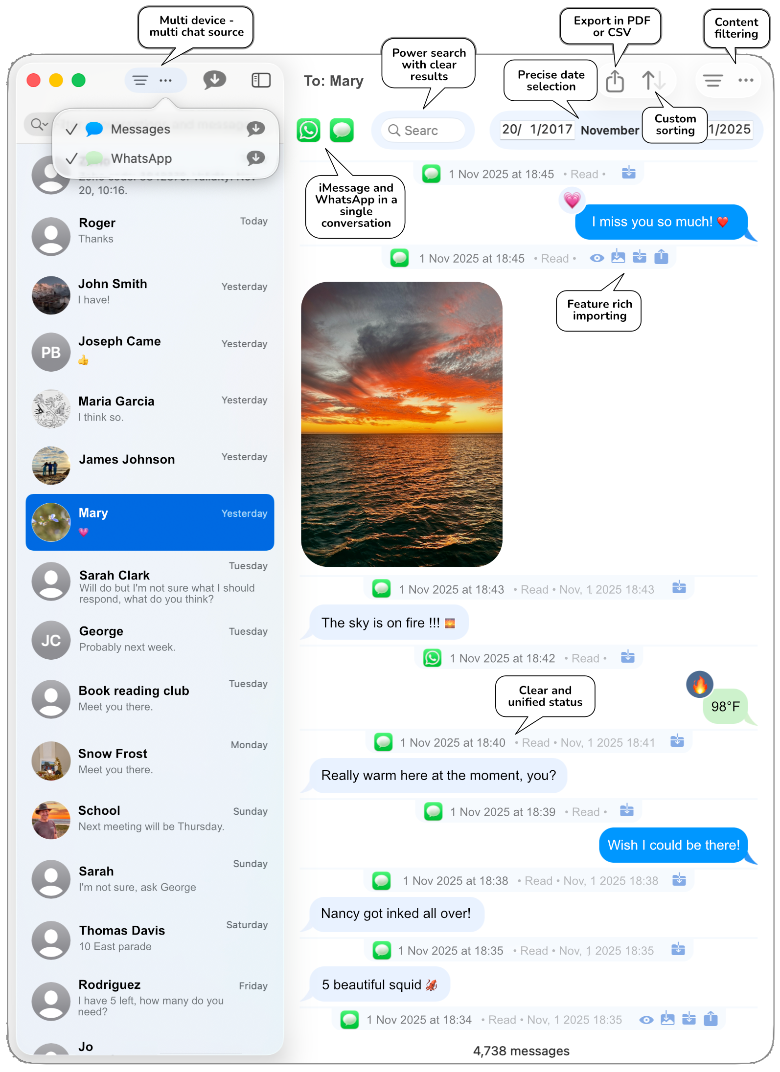 Extract messages directly from your iPhone, iPad, or Mac with simple guided steps. Use multiple sources and devices in one unified interface, making searching, sorting, exporting, and printing a breeze.