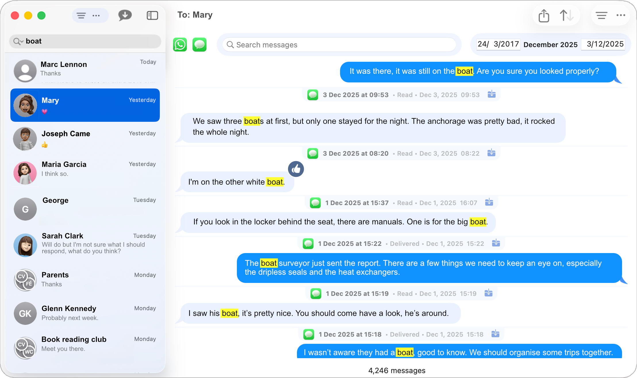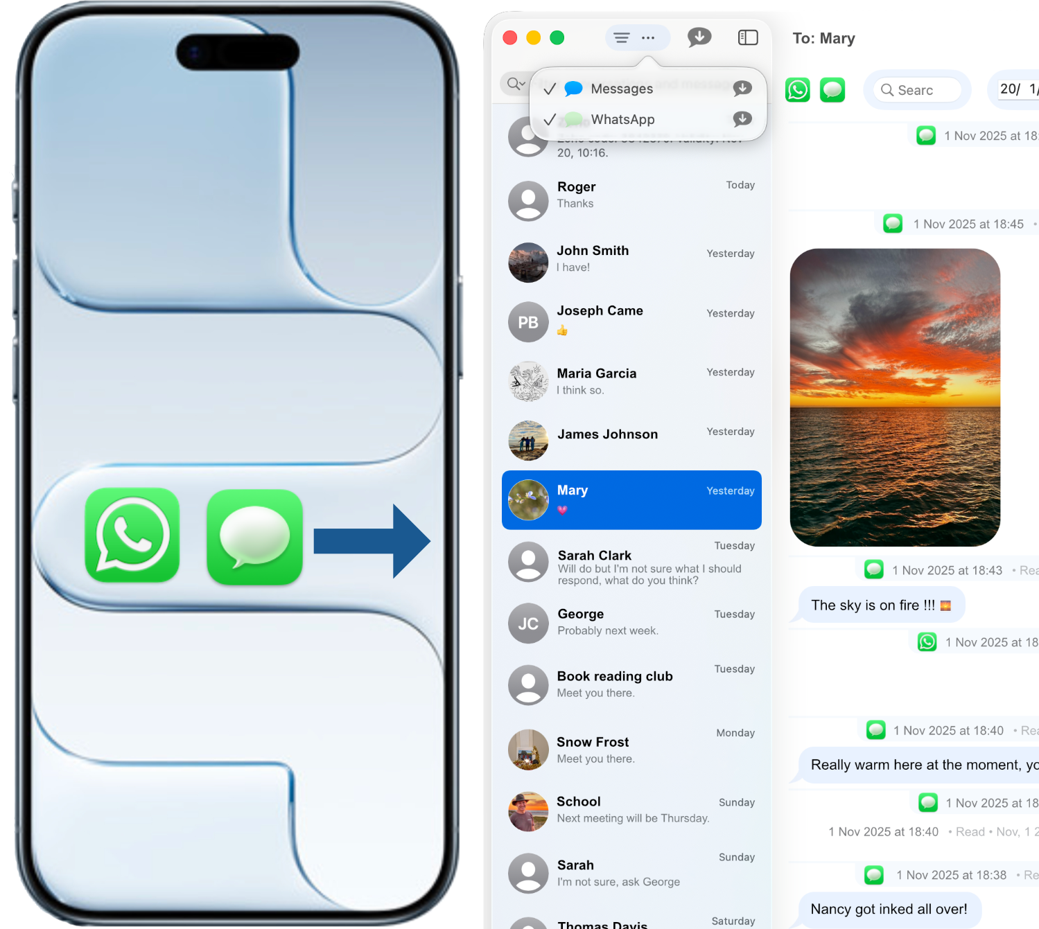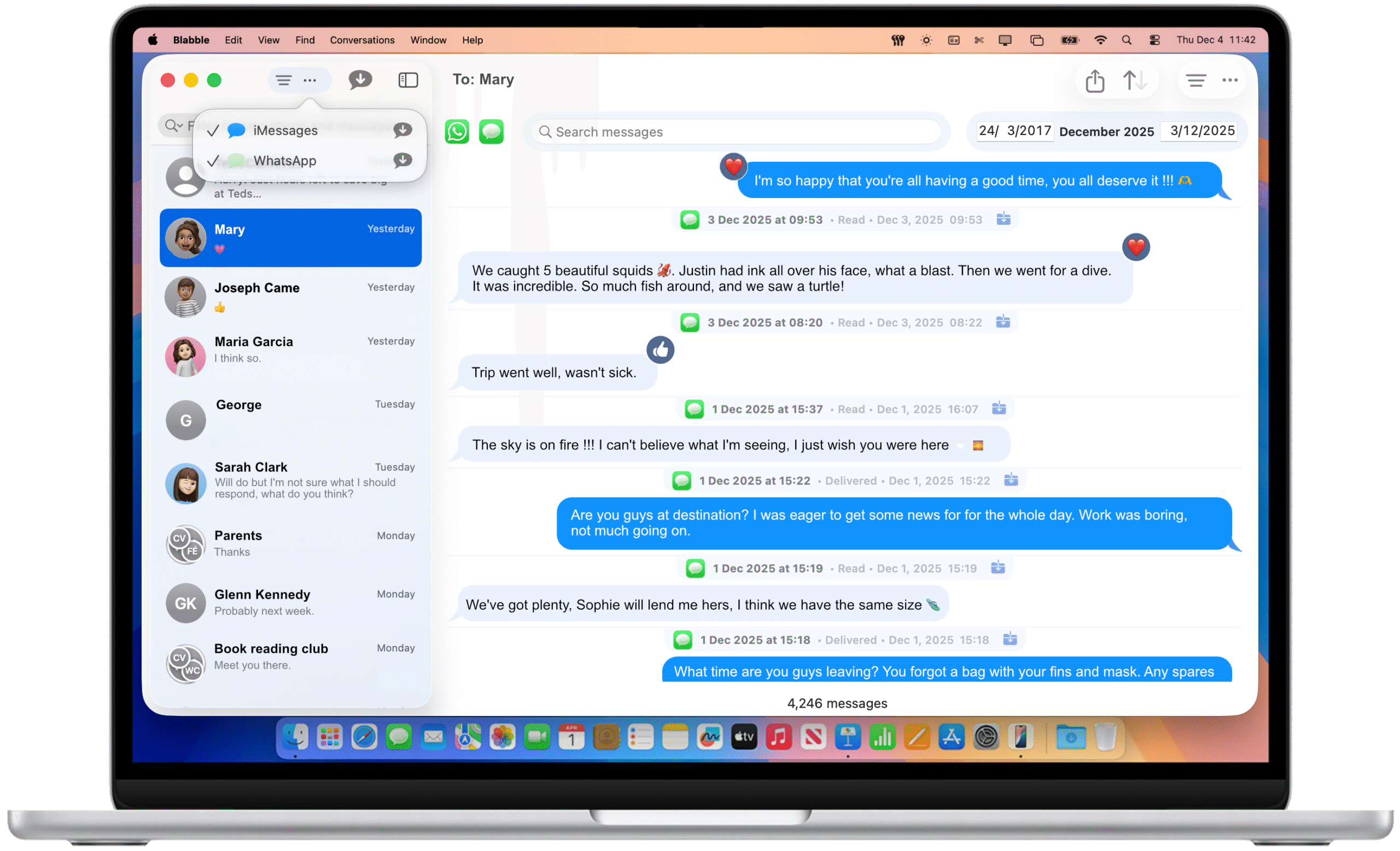Follow a conversation seamlessly, even when it spans different apps. Blabble brings your iMessage and WhatsApp threads together into one continuous view, letting you read, search, and export the full story without switching platforms or losing context.