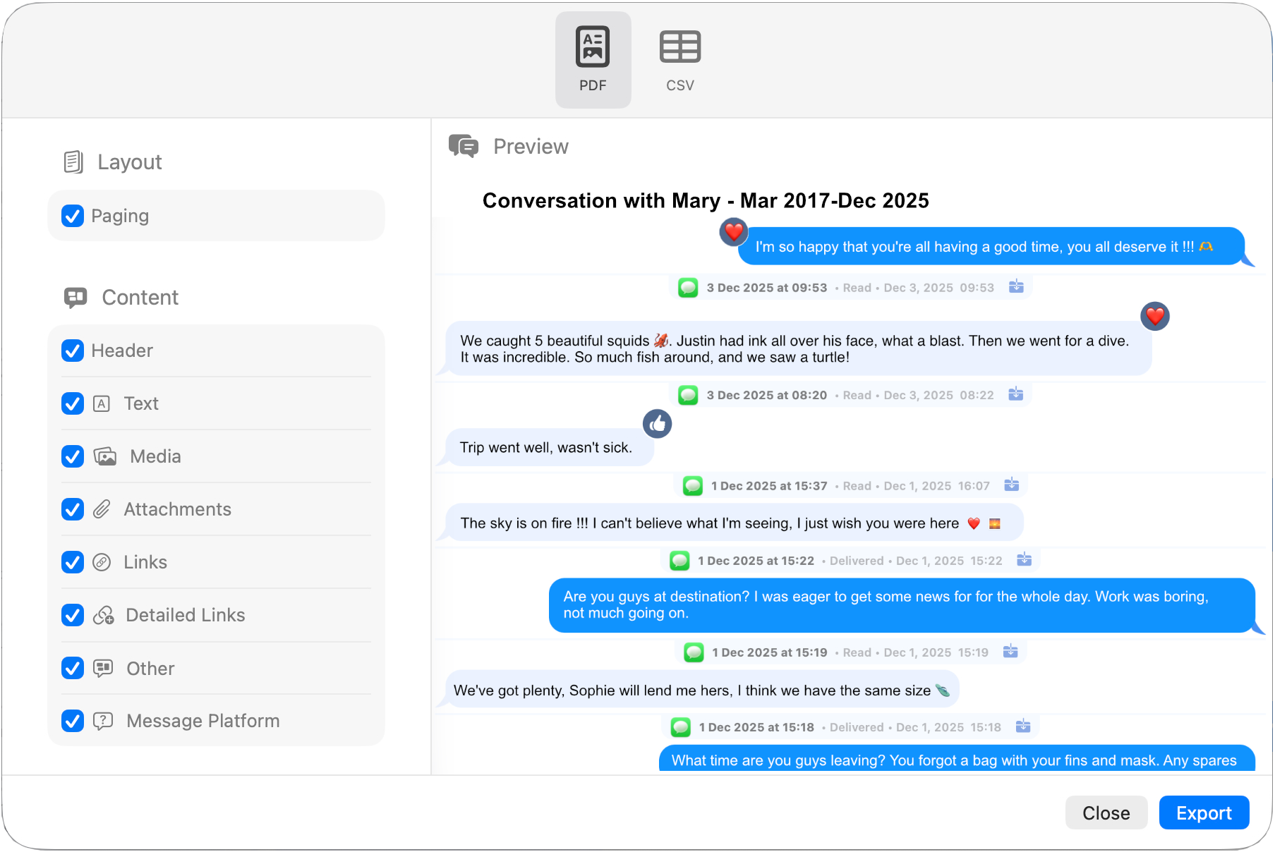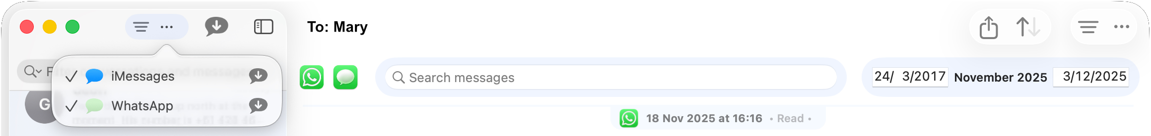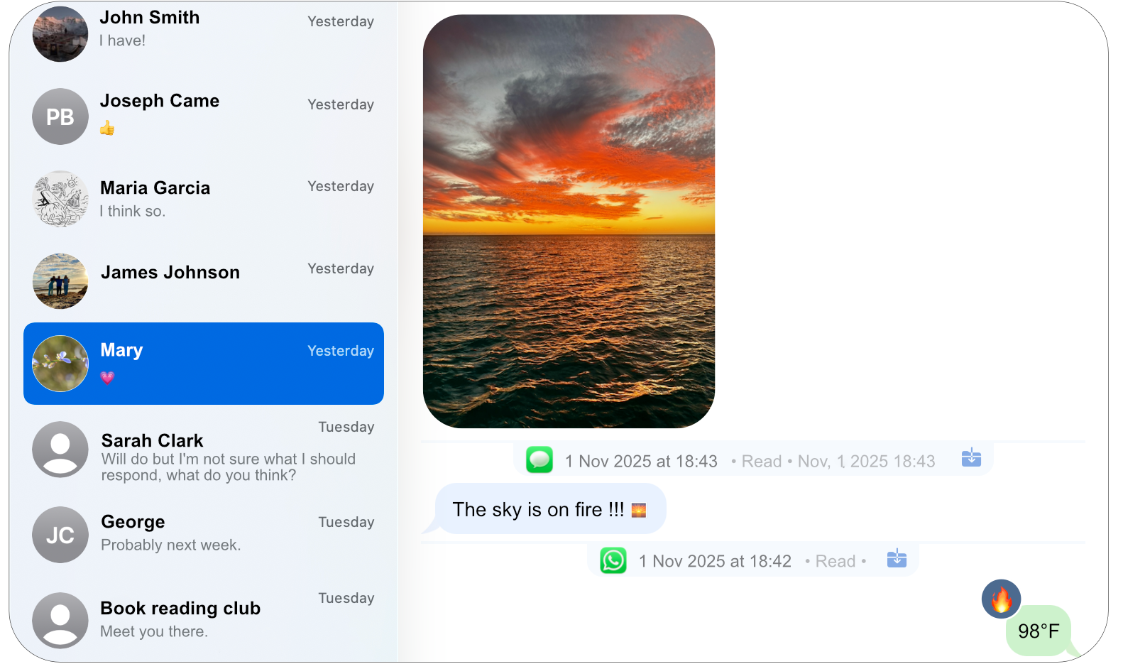 Follow a conversation seamlessly, even when it spans different apps. Blabble brings your iMessage and WhatsApp threads together into one continuous view, letting you read, search, and export the full story without switching platforms or losing context.